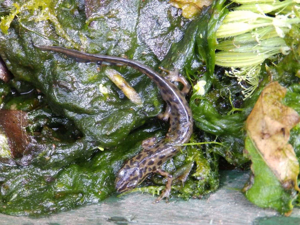 Deze salamander heeft zich bevrijd uit de alg die uit de vijver is opgedregd. Hij klautert de kruiwagen uit, het vijverwater en de vrijheid tegemoet!
