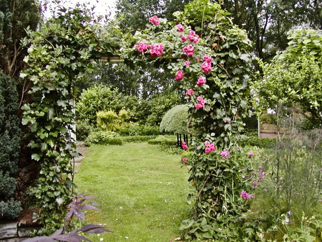 De pergola heeft het ondertussen begeven en is vervangen door een nieuwe. Het houtwerk van de oude werd slechts door de wortels van de klimop bij elkaar gehouden. Het werd echter steeds moeilijker om de woekerende klimop in toom te houden. En ook de romantisch rozen bleken stekelig en weerbarstig als ze opgebonden moesten worden. Daarom komen op de nieuwe pergola slechts 'lieve' en bloemrijke klimplanten, zoals een vaste siererwt, clematis of kamperfoelie.