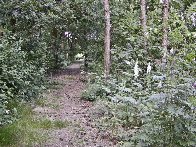 Het bospad is breed genoeg om de zitmaaier door te laten, en ook breed genoeg voor een auto of grote trekker. Soms moet er met groot materieel preventief worden gespoten tegen de eikenprocessierups, en het is dan zaak dat de megaspuit helemaal tot in de achtertuin kan komen.