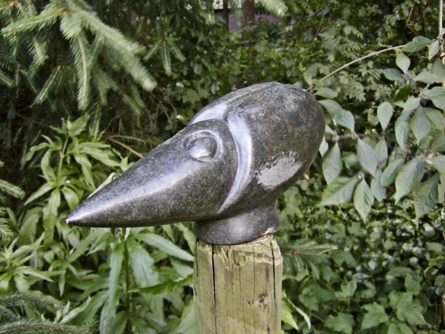 Het kan verrassend zijn om op bijvoorbeeld midden in de border een beeld in de tuin te zetten. In dit geval in de schaduwborder, die de begrenzing vormt tussen bos en tuin. Om het beeld goed te laten uitkomen, is het op een paaltje geplaatst.