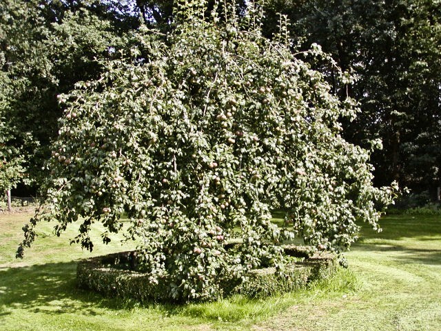 In de boom slingert zich de heerlijke geurende roos 'New Dawn' omhoog, een troost voor als de perenoogst uitblijft (wat nogal eens voorkomt).