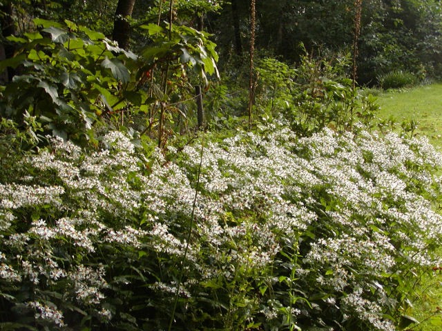 Deze plek is vrij droog omdat de bomen veel vocht onttrekken aan hun nabije omgeving. Op deze plek is de Aster divaricatus een uitkomst: hij kan goed tegen schaduw en minder goede bodemomstandigheden, en laat de donkere plek vrolijk oplichten met een wolk van witte bloemetjes.