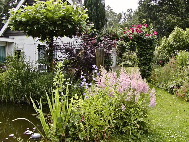 Een vijverrand is een dankbaar gedeelte om te beplanten. Mooie grassen en bijvoorbeeld Astilbe kunnen prima aan de vijverrand. Ook planten met groot blad doen het goed. Zo is op een andere hoek aan de vijverrand rabarber geplant. Het golvend blad is zeer decoratief. Dat de plant dicht bij de keuken staat, is een handige bijkomstigheid.