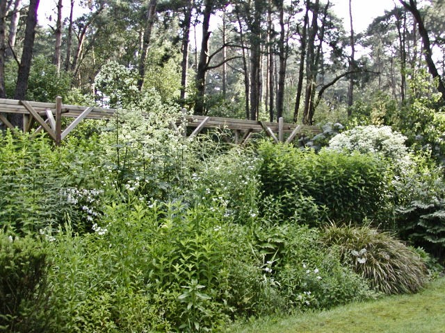 Ook hier begrenst de taxushaag de border aan drie zijden. Een zonnige plek, die in droge tijden echter voldoende water moet krijgen. De Clematis recta doet het hier goed, evenals de Crambe cordifolia en witte phloxen.