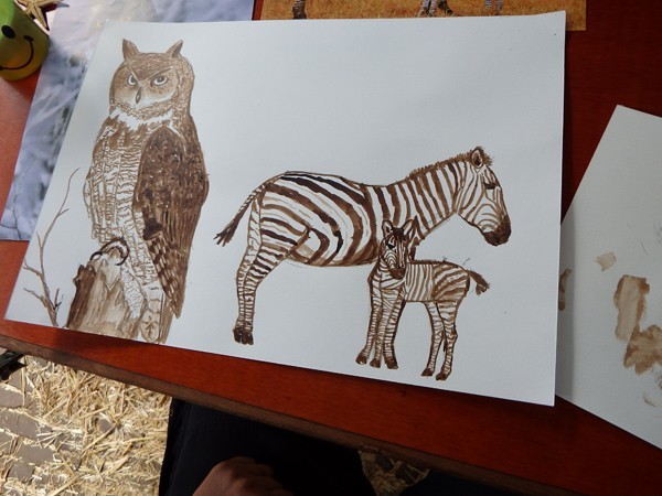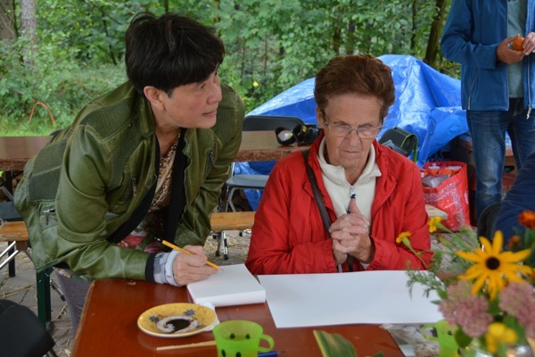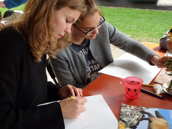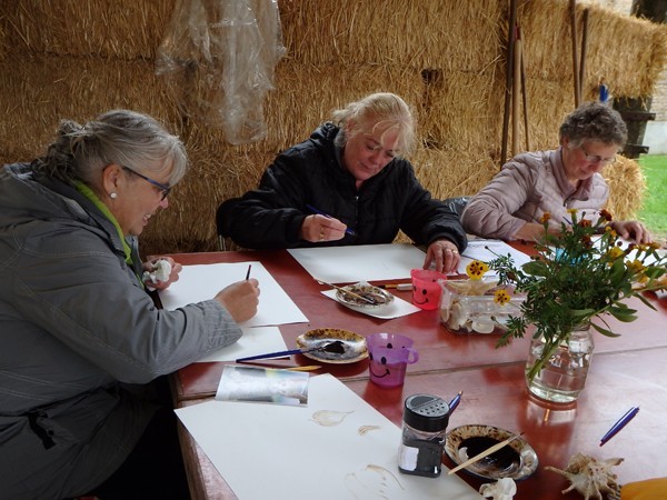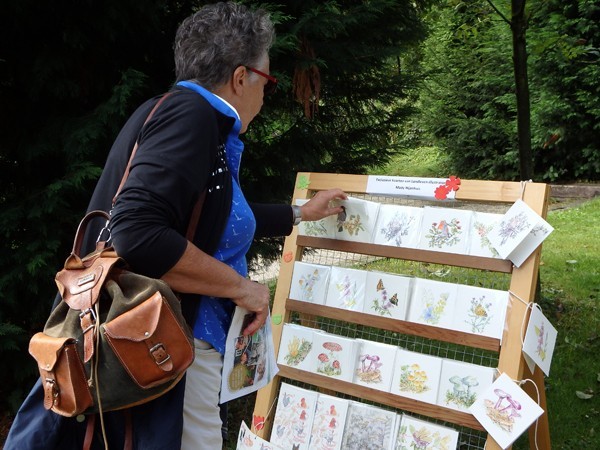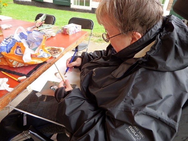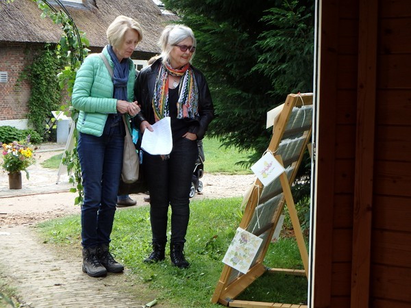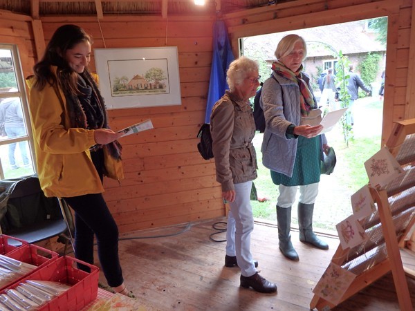 De bezoekers trotseerden moedig de regen die vrijdag met bakken uit de hemel viel. Onder het ruime dak van de kapschuur zaten we droog, al moest soms het papier met plakband aan de tafel worden bevestigd tegen onverwachte windvlagen. Mensen die nog nooit van bister hadden gehoord werden zo enthousiast dat ze met een zakje bister en het voornemen om verder te tekenen naar huis gingen.
