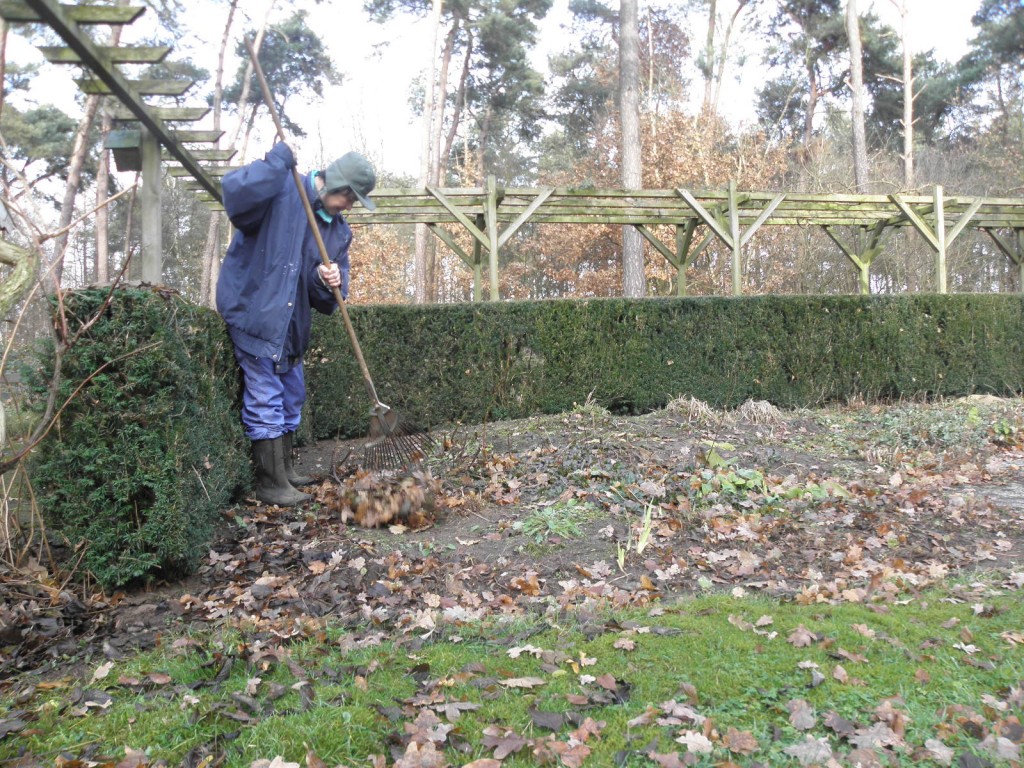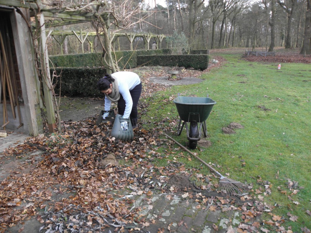 Handmatig werken is niet te vermijden: de bladhopen moeten in kruiwagens worden geschept en gaan terug onder de bomen in het bos waar ze vandaan komen. Zogenaamde schephanden zijn hierbij uiterst handig.