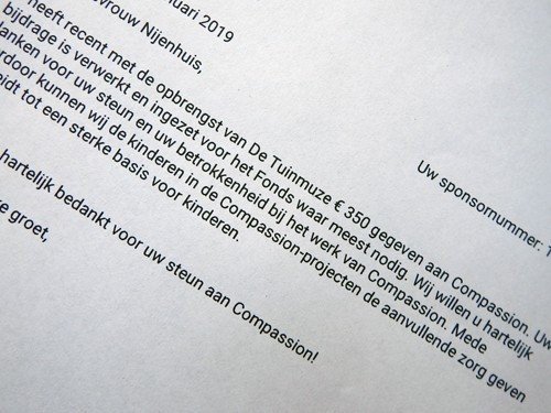 De opbrengst van de tuinbezoeken en de plantjes van vorig jaar is 350 euro. Dit bedrag is gestort op de rekening van Compassion, en ingezet voor het 'Fonds waar meest nodig'.