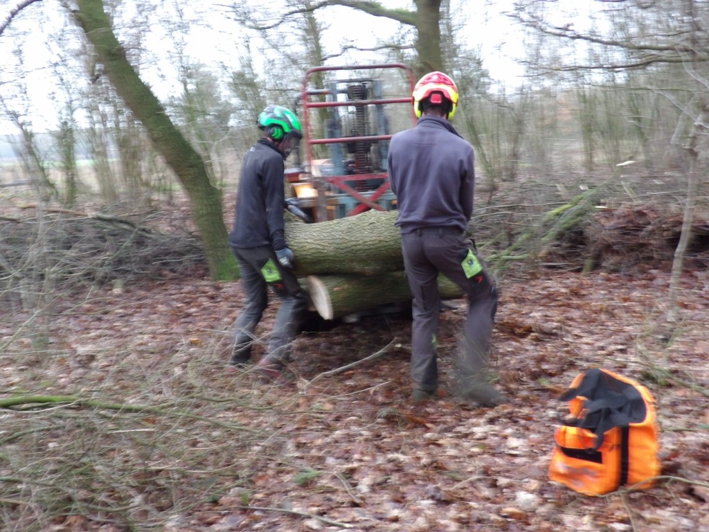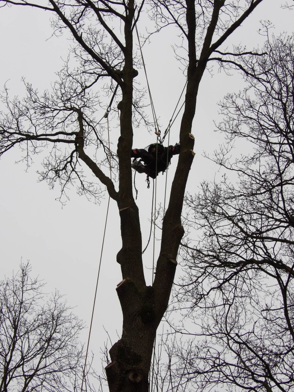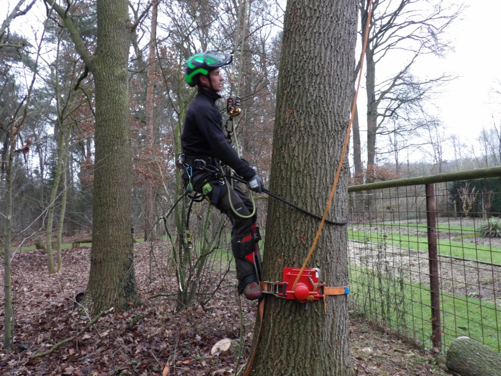 Om de eik naast de moestuin te vellen heb ik Vincent Vellekoop (Vellekoop Groenbeheer in Zelhem) ingehuurd. Vincent was de klimmer. Grondman en broer Jilles nam alles op de grond voor zijn rekening, en dat was behoorlijk zwaar. De takken die gecontroleerd aan dikke touwen naar beneden kwamen waren niet kinderachtig.