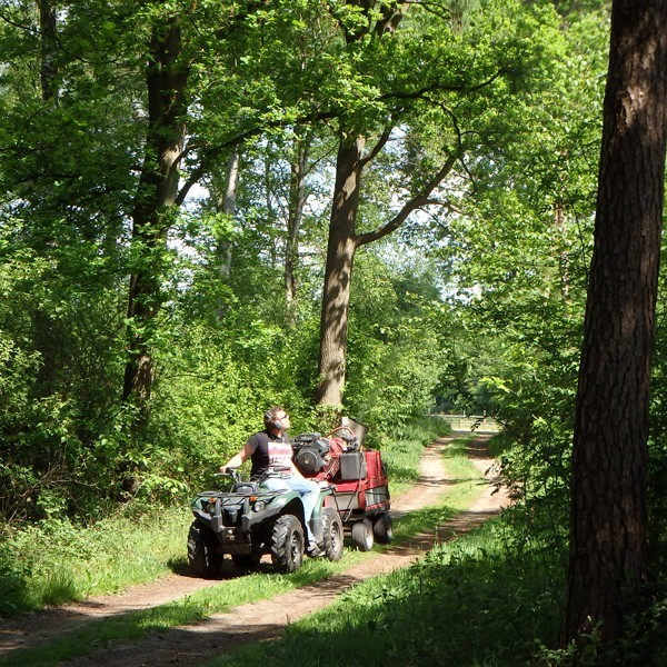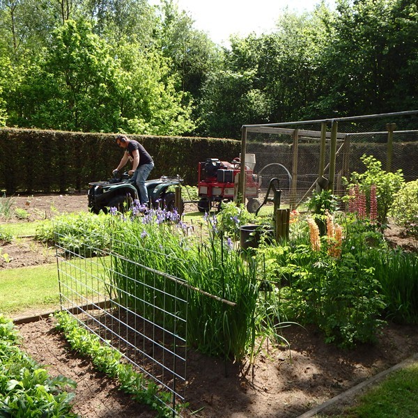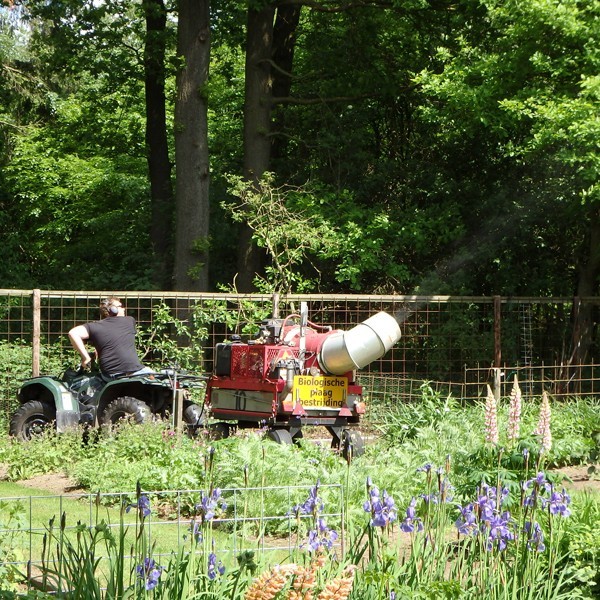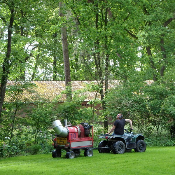 Met de zeer wendbare quad kon Marinus tot in de verste hoeken van mijn tuin komen om de omringende eiken te behandelen. De weersomstandigheden waren optimaal, dus hopelijk hebben wij ook dit jaar geen overlast van eikenprocessierupsen op het erf!