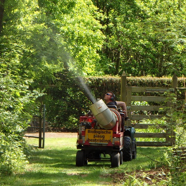 's Morgens reed uitvoerder Marinus voor op zijn quad. met daarachter een tank en een spuitkanon. Met deze boomnevelspuit wordt een biologisch middel (Xen Tari WG ) tot in de toppen van de eiken gespoten. Het is alleen effectief op rupsen. Als de rups van het eikenblad eet, vormt het middel in het maagdarmkanaal een toxine. Dat is het einde van de rups.