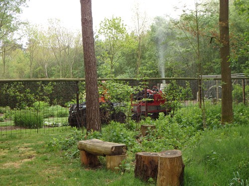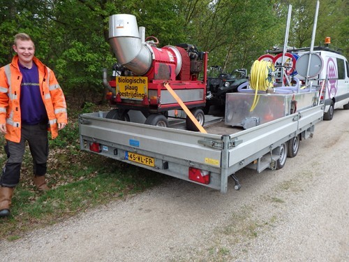 De bestrijding werd uitgevoerd door de Nationale BomenBank. Al vroeg in de morgen kwam Jelle voorrijden om zijn ronde op mijn erf te maken. Dankzij de zeer werndbare quad kon hij in alle hoeken van de tuin komen. Een minikanon spoot een nevel van water en Xentari tot aan de kruinen van de eiken. Xentari is een biologisch bestrijdingsmiddel dat geen schadelijke gevolgen heeft voor de talloze vogeltjes en andere bewoners van mijn tuin, zo is mij verzekerd. En dat blijkt helemaal waar.