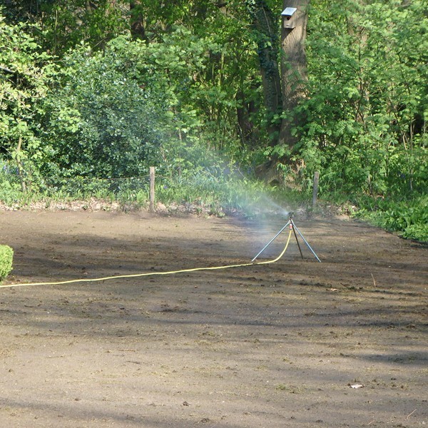 Het milde weer hielp mee met zachte meiregens, en toen het warmer werd liet ik de sproeiers in actie komen. Ik keek de sprieten de grond uit.