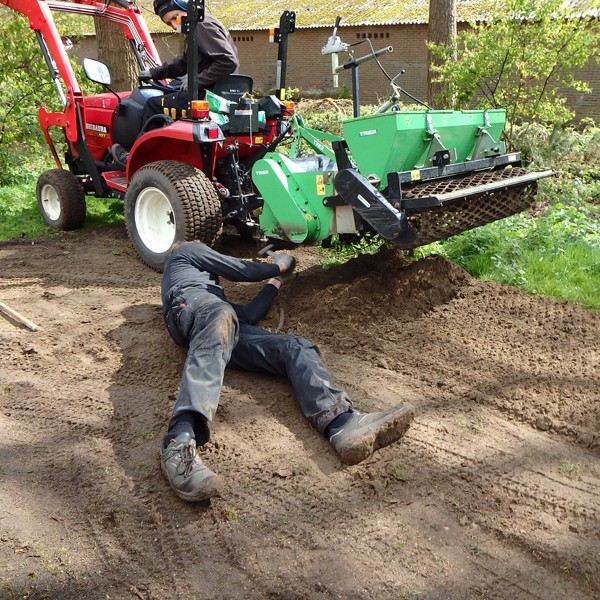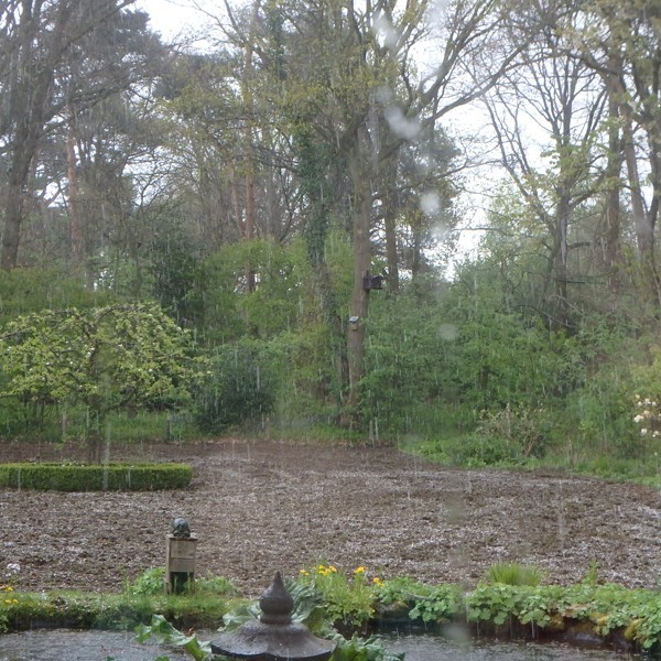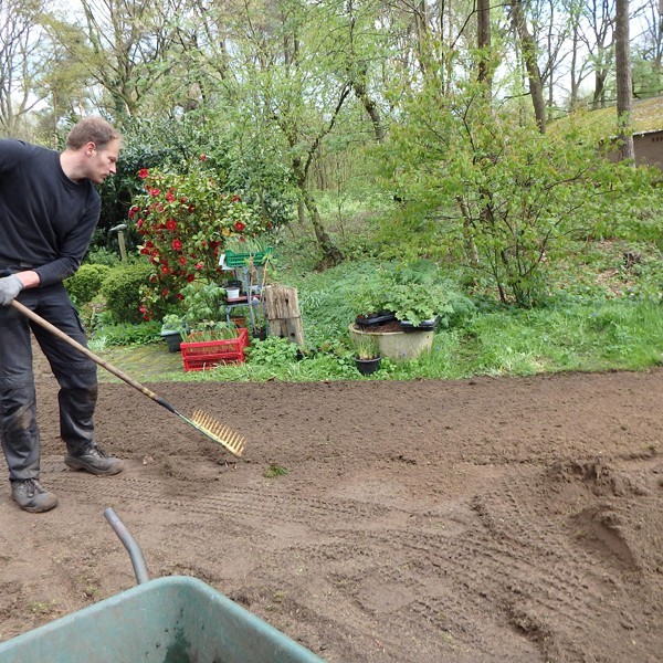 Henriko bekeek de situatie, en legde mij een programma voor van overtoppen, vlakken, kopeggen, inzaaien, bemesten en rollen. Midden april zou met het werk begonnen moeten worden en zes weken later zou de tuin klaar moeten zijn voor het opentuinweekend begin juni. Henriko had er alle vertrouwen in. Met een beetje geluk met het weer en vooral veel sproeien moest het lukken.