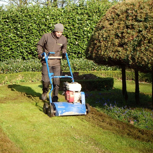 Gedreven door het instructiefilmpje dat Landleven over verticuteren op ons gazon had gemaakt belde ik 'De Struu' van gazonspecialist Henriko Berendsen. Ik wil een echt gazon, en niet een waarop ik tijdens het maaien de messen soms met een ruk omhoog moet trekken bij niveauverschillen of waarbij de rook uit de machine komt omdat hompen mos de zaak doen vastlopen. Jarenlang geen bemesting, zure zandgrond, plaatselijk veel schaduw en hopen eikenblad in de herfst maakten dat het gras langzaam wegkwijnde.
