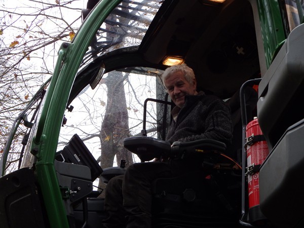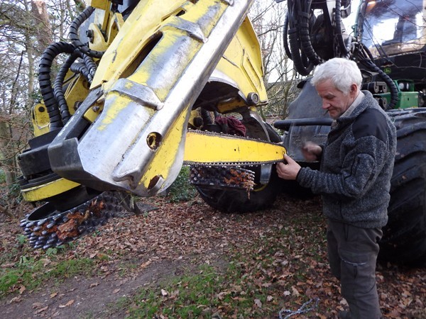 Begin januari komt Karel met een ander type Forwarder om de kruinen op te halen en op een hoop te stapelen. Ook bij hem mag ik even in de machine ervaren hoe hij zijn werk doet.
