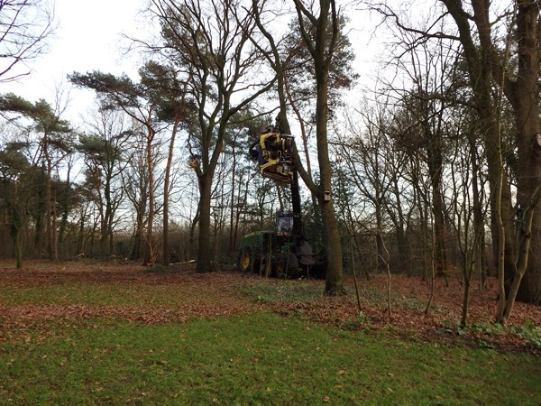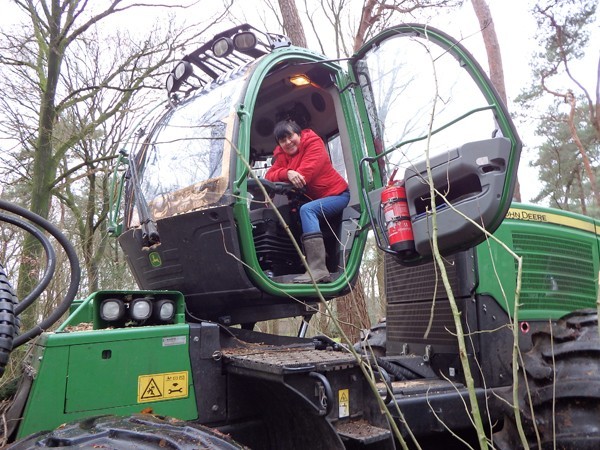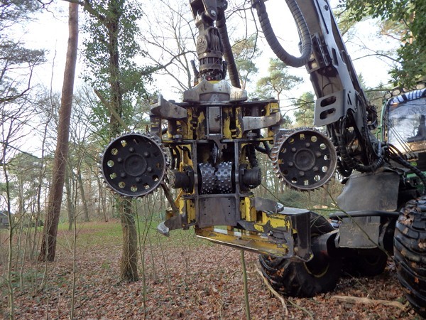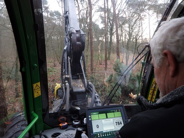 Het lage geluid van een machine vertelt mij - weken later - dat het vellen is begonnen. Gebiologeerd kijk ik naar de 'Harvester', een machine die binnen vijf minuten een boom velt, in gelijke stamdelen zaagt en van de kruin ontdoet, en alle relevante informatie van de boom registreert. Hij wordt bediend door Henk Sanders, die al bijna 50 jaar 'in het vak' zit. Begonnen met een handzaagje, heeft hij zich nu de techniek van de computergestuurde Harvester eigen gemaakt. 'Dat spaart weer een opleiding van 60.000 euro in Finland uit,' lacht hij. 'En dan weet je alleen nog maar hoe je dit apparaat kunt besturen, maar dan heb je nog geen verstand van hout. Ik heb een programma voor Douglas/Larix, grove den en loofhout. De druk varieert afhankelijk van het soort hout.' Hij manoeuvreert voorzichtig tussen de bomen in mijn bos door en spaart grenspaaltjes, vogelhuisjes en vooral mijn gazons. Natuurlijk vraag ik of ik ook in de cabine mag. Ja dus! Henk werkt rustig door. In de cabine is het opmerkelijk stil, vergeleken met het geraas daarbuiten. Ik voel me de koning te rijk dat ik mee mag rijden in dit apparaat van vijf ton.