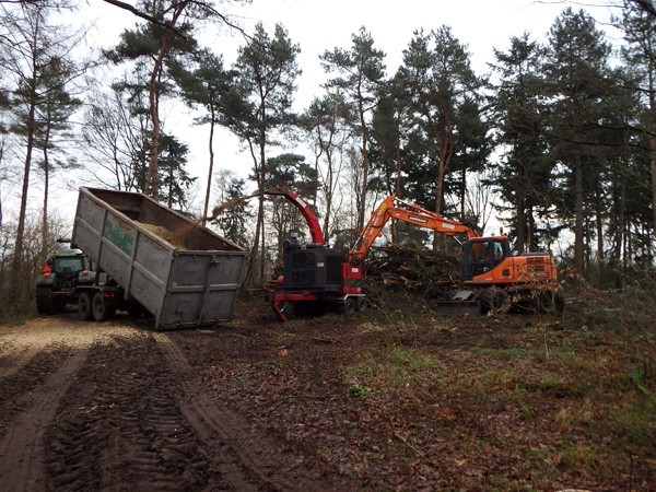 Roy maakt daarna de klus af met drie machines tegelijk: de kruinen worden gehakseld en in containers weggevoerd. Bestemd voor biomassacentrales.