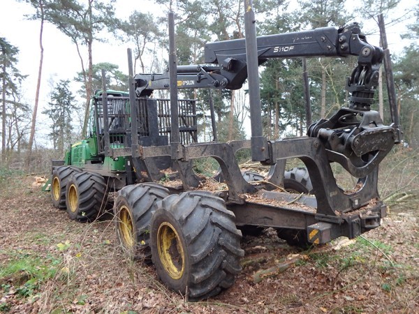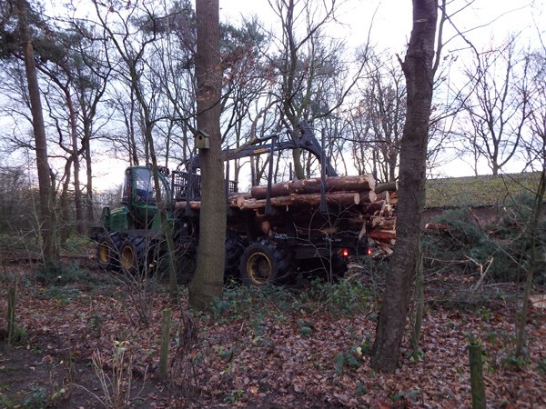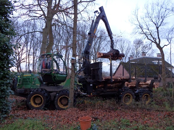 Een paar dagen later komt Henks zoon Mourice met de Forwarder (uitrijder) de stammen ophalen. Ook dit bakbeest wordt voorzichtig tussen de bomen in mijn kleine bos gestuurd. Dat het een slagveld lijkt door de kleine struiken die moeten wijken en de diepe bandensporen is onvermijdelijk. Mijn ervaring is echter dat alles binnen een paar maanden weer dichtgegroeid is. Mourice sorteert de stammen en legt ze netjes aan de weg, zodat de vrachtwagens ze straks gemakkelijk kunnen ophalen. Van Henk hoor ik voor het eerst over uitrijderswedstijden. Mourice schijnt er hoog te scoren!