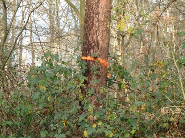 Terwijl Pieter de bomen die verwijderd moeten worden markeert, slaat hij tegelijkertijd de soorten en volumes op. In mijn bos gaat het om 40 bomen, waaronder eiken en grove dennen.