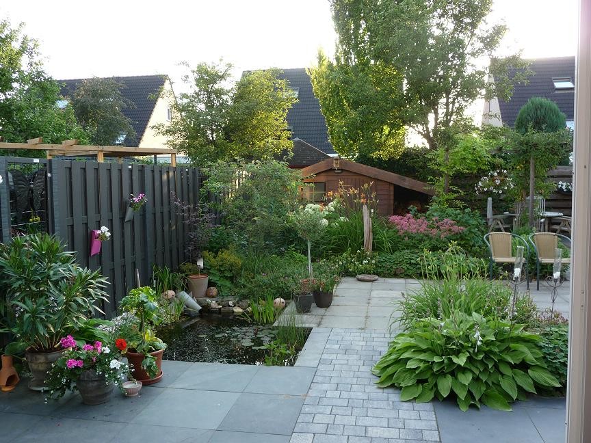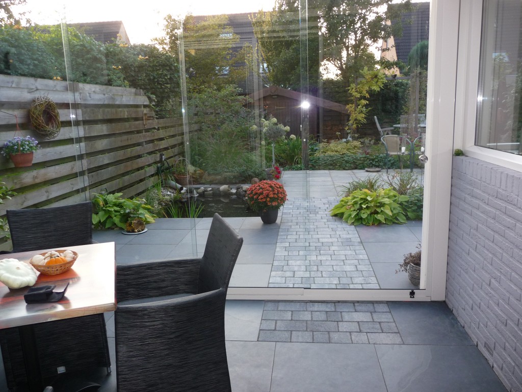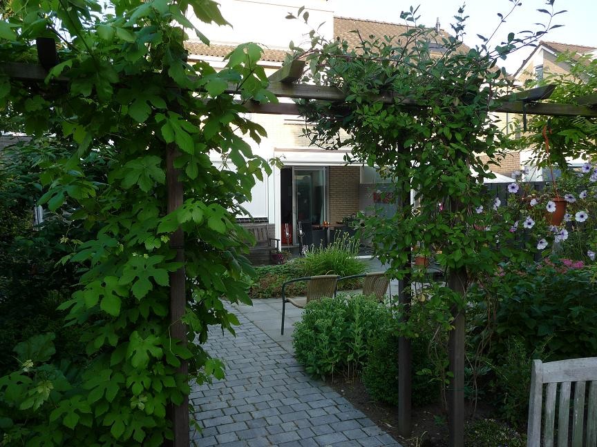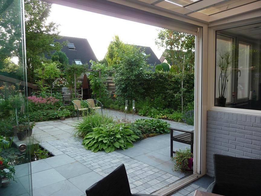 Aanleiding van een nieuw ontwerp voor de achtertuin van dit gezin was de pas aangebouwde serre. Grote glazen deuren scheiden het huis van de achtertuin, een mooie gelegenheid om huis en tuin in elkaar te doen overlopen. Door toepassing van dezelfde bestrating en hetzelfde patroon voor binnen en buiten werd dit effect bereikt. Bovendien is de tuin zeer onderhoudsvriendelijk: de plantvakken maken het geheel overzichtelijk in onderhoud. Veel aandacht is besteed aan de variatie in hoogte en bladstructuur van de planten.