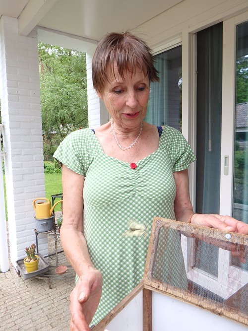 Lida hield woord. Kortgeleden kwamen zij en haar man Ferdi bij mij met een kasje. Daarin zaten poppen en een prachtige koninginnepage, die popelde om naar buiten te gaan. Ook kon ik de mooie poppen van dichtbij bekijken. Het deurtje ging open, en daar ging de vlinder. Tot heel hoog in de lucht.
