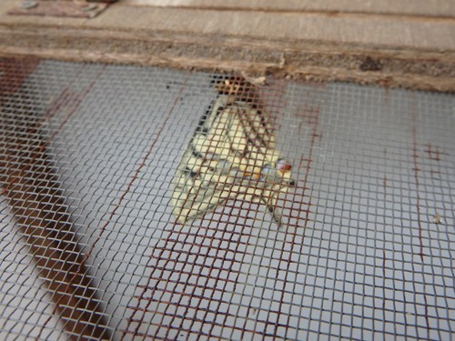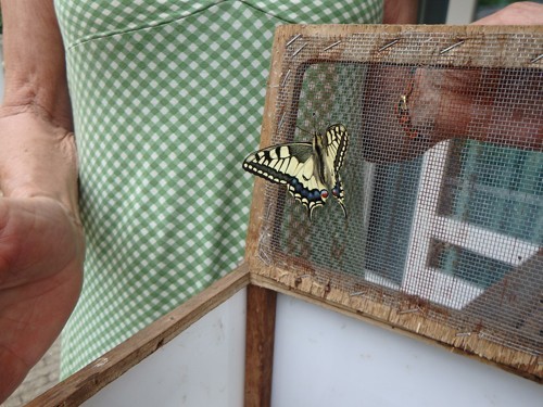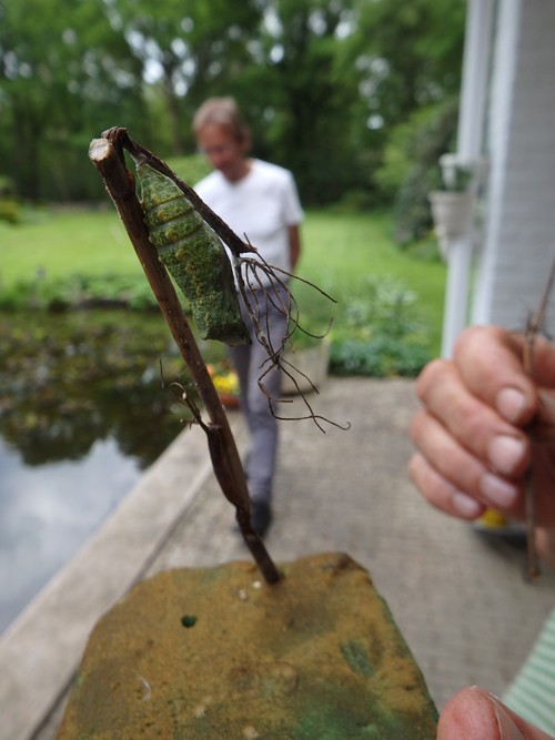 Vorig jaar plukte Lida Jolij (vlinderbeschermer en -specialist) twee rupsen van de koninginnepage uit mijn wortelloof. Zij bracht ze naar haar huis, niet ver hiervandaan, waar ze een indrukwekkende verzameling kasjes met rupsen en poppen heeft. In de kasjes worden de rupsen gekoesterd met lekkere blaadjes en mogen ze zich veilig en ongestoord verpoppen, niet belaagd door sluipwespen en andere rupsendoders."Ik breng de vlinder terug als hij uitgekomen is," beloofde ze.