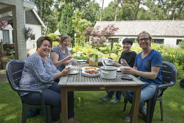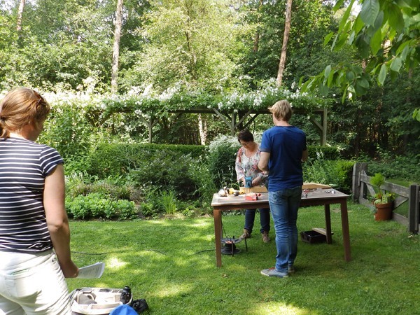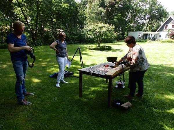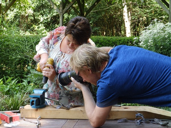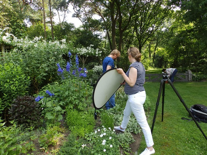 Dan kan een hulpscherm handig zijn. Redacteur Esther van Middendorp, fotograaf Lode Greven en 'bestekboeket-maakster' Alie van Veldhuizen waren er enkele uren mee zoet. Ik mocht er bovenop zitten en kon letterlijk een kijkje achter de schermen nemen in mijn eigen tuin.