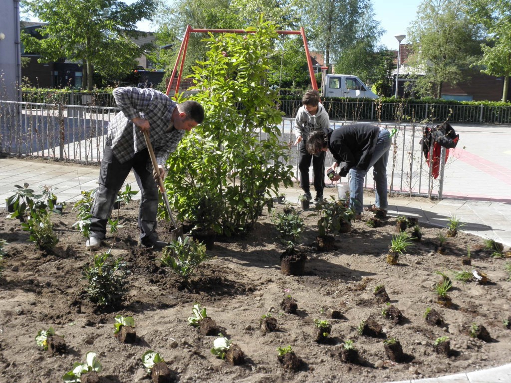 De Tuinmuze werd gevraagd om het beplantingsplan en de begeleiding. Hoveniersbedrijf Remco Peters voerde het totale plan uit. Op de plantdag, begin mei, was het behoorlijk warm. Voordat de planten de grond in gingen, kregen ze een dompelbad waar ze net zo lang in bleven, tot de hele kluit door en door nat was.