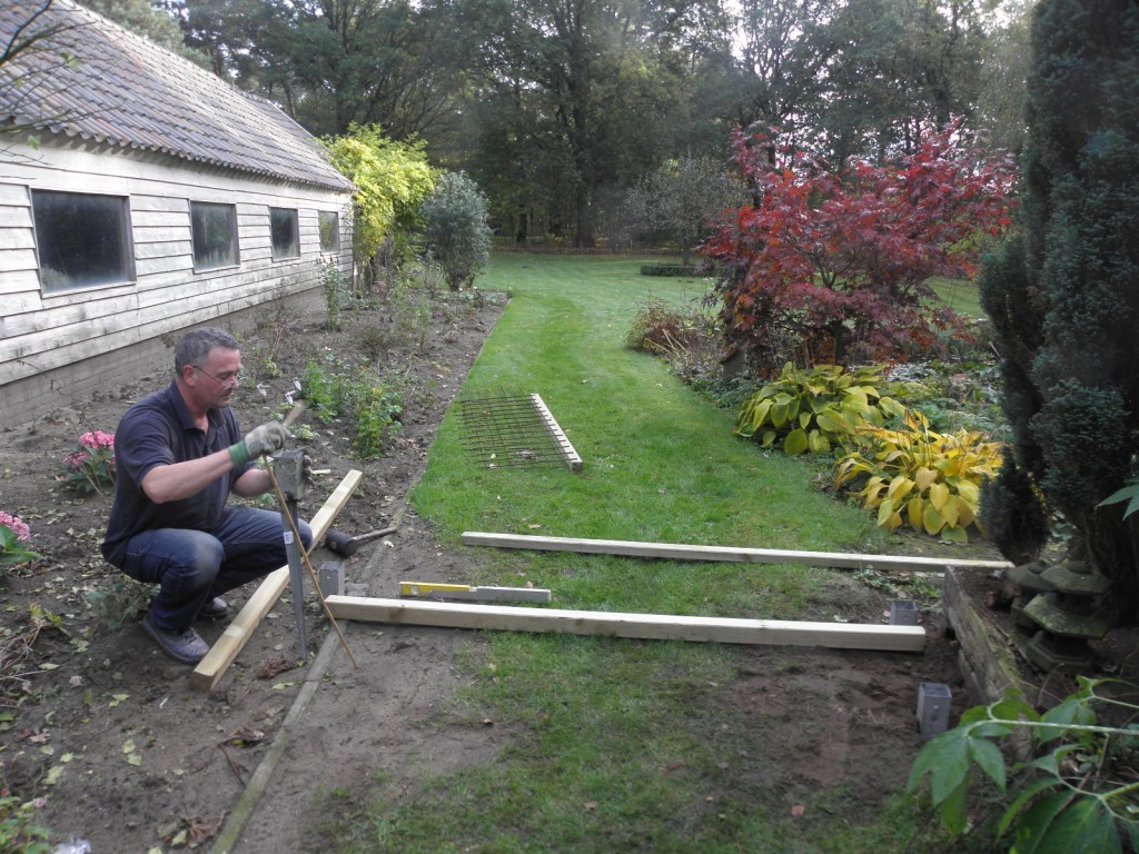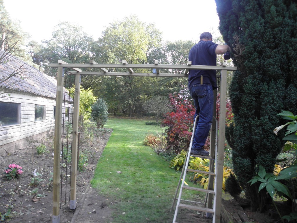 27-10-2011De oude pergola is verrot, slechts de wortels van de woekerende klimop houdt hem bij elkaar. Hoog tijd voor iets nieuws!