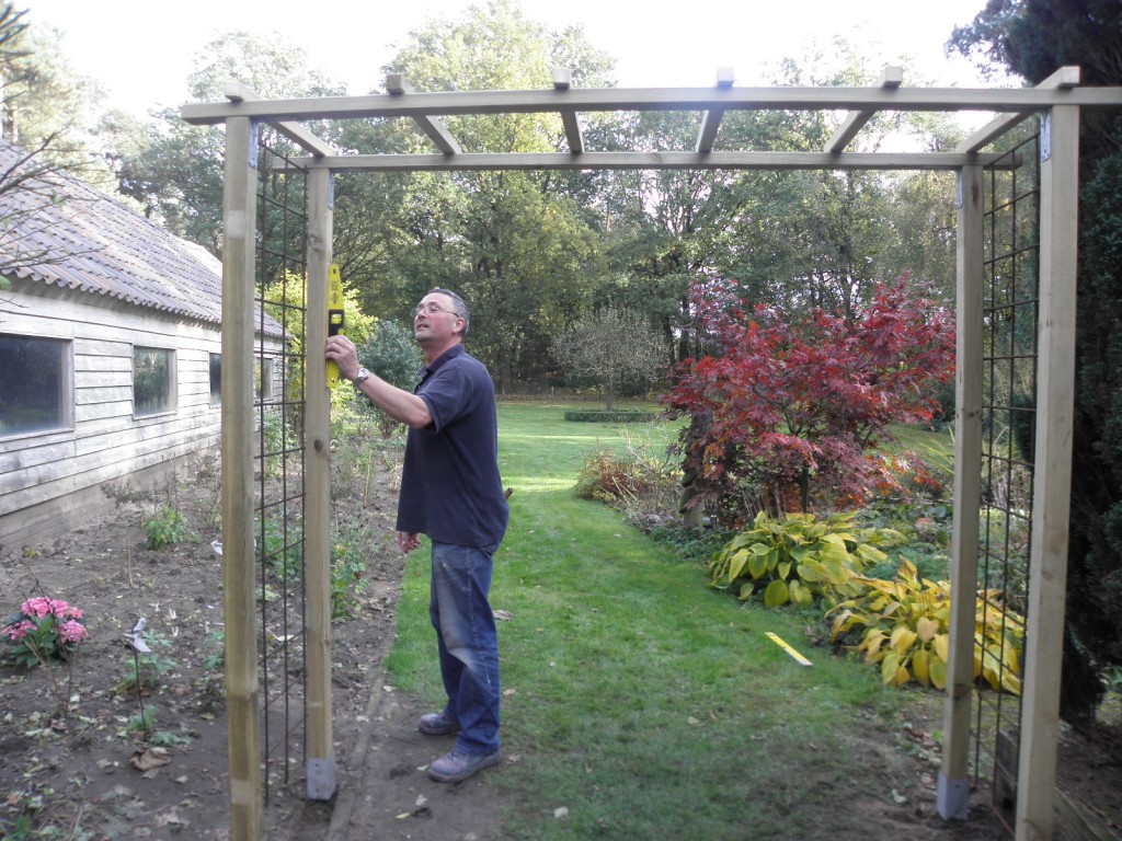 Michel zet voor mij de nieuwe pergola in elkaar. Nauwkeurig wordt alles op maat gezaagd. Dan staat hij er, waterpas. Nu kan ik hem laten begroeien met mijn favoriete klimplanten. Klimop komt er niet meer bij!