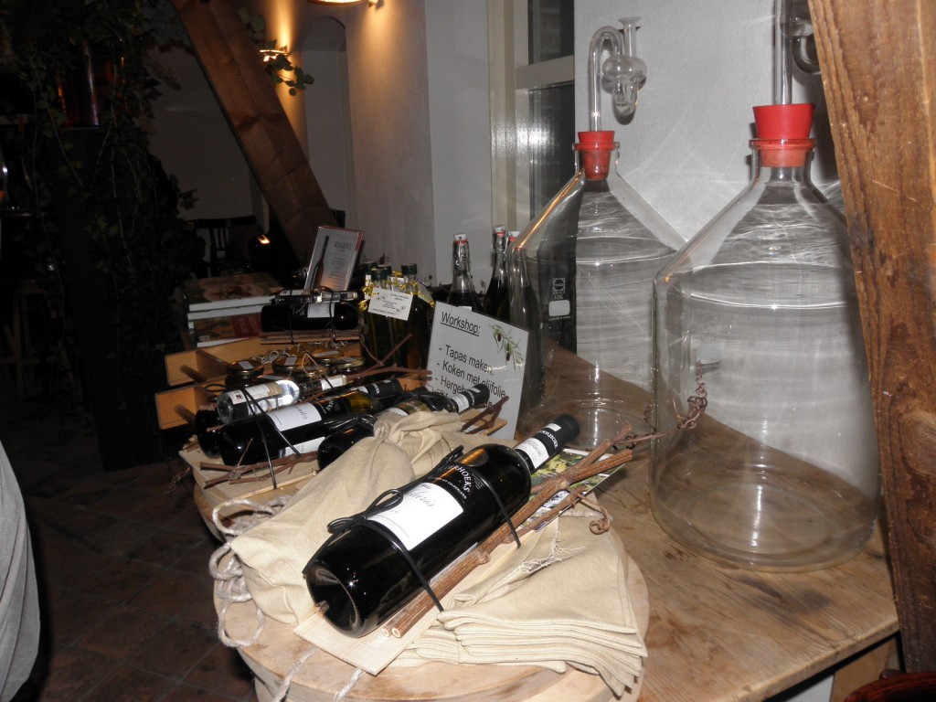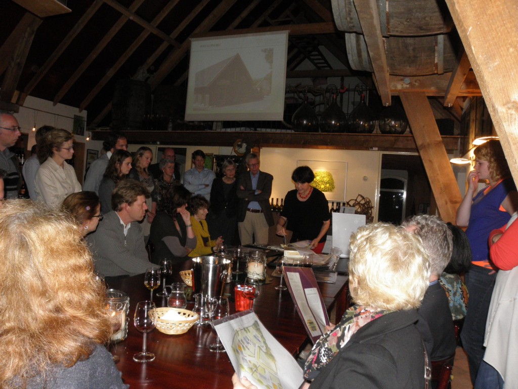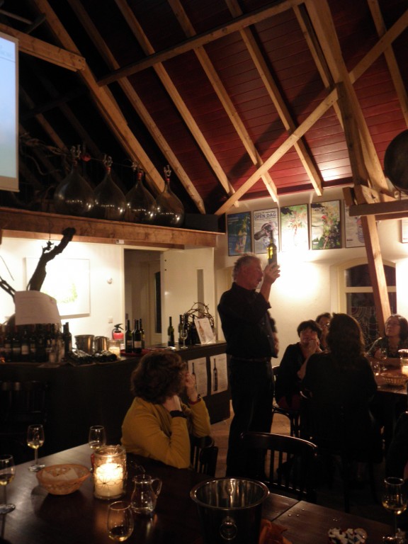 De wijnproeverij vond plaats in de gezellig ingerichte schuur. Henk liet zien hoe je wijn proeft en de deelnemers kregen dan ook verschillende soorten wijn om dit te ervaren. Ook vertelde Henk wat er allemaal bij een wijnbedrijf en het wijn maken komt kijken. (www.wijngoedkranenburg.nl).