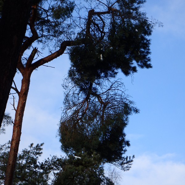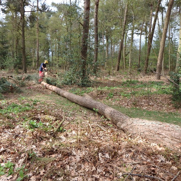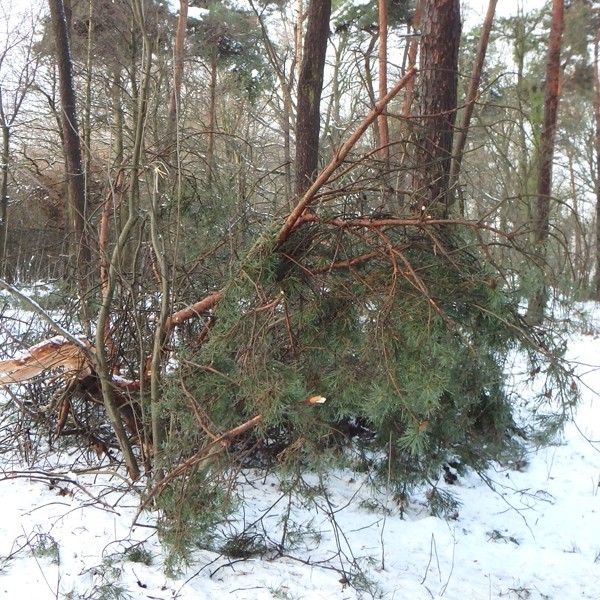 Vooral de grove dennen in het bos hadden veel afgescheurde takken. Dat was niet erg als ze op de grond lagen, maar de half afgebroken takken die nog aan de stam bungelden vormden op den duur een gevaar.