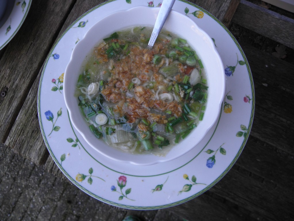 Een snel gemaakte lekkere lunch om nieuwe energie op te doen is dit lentesoepje. Roerbak in wat zonnebloemolie wat gehakt (gekruid met peper en zout) rul, voeg een gesnipperd uitje en in reepjes gesneden ijsbergsla toe. Voeg er water bij en een pakje noodlesoep, compleet met kruiden. Heel even laten koken. Maak af met gesnipperde selderij en lente-uitjes en gefruite uitjes.