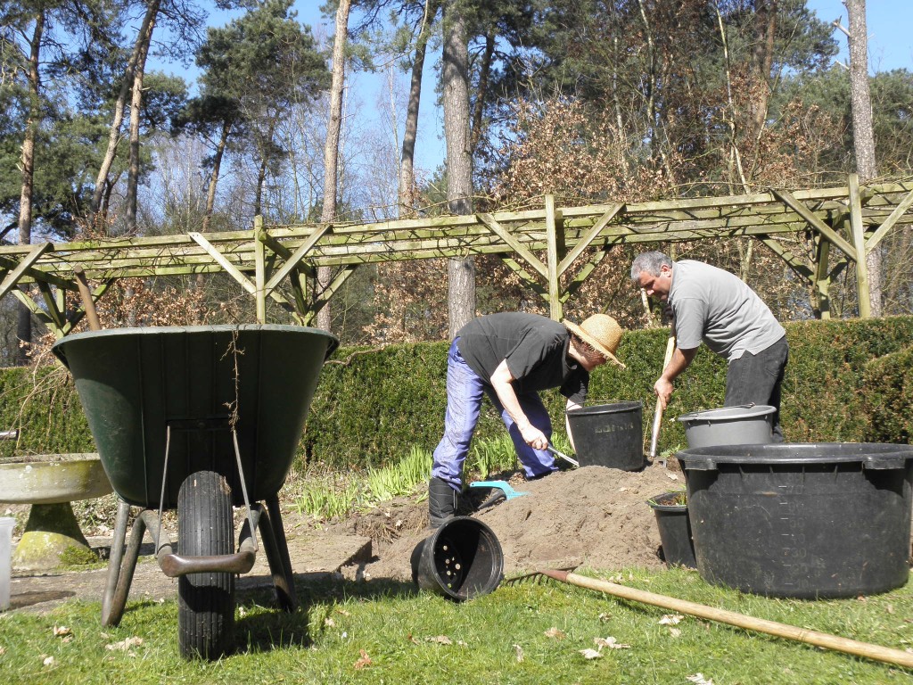 Het is maart, maar bloedheet als je in de zon werkt met weinig wind. De gescheurde plantenpollen die opnieuw gebruikt worden of uitgedeeld worden aan vrienden en familie gaan direct in bakken met een laagje water. Het plantgat wordt ook rijkelijk van water voorzien.