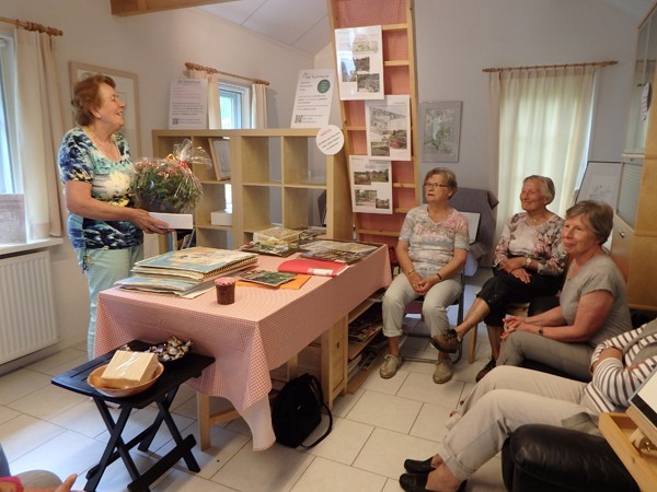In het tweede deel van het tuinbezoek hield ik een praatje over mijn illustratiewerk, na de koffie en crackers met zelfgemaakte rabarber-vijgenjam.