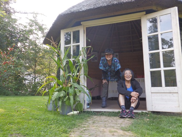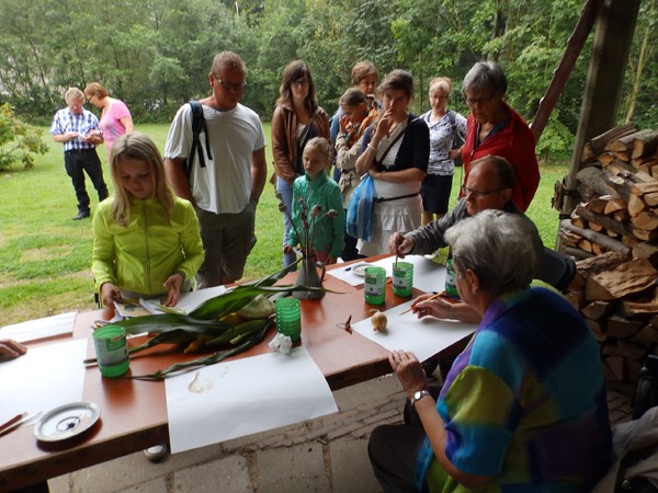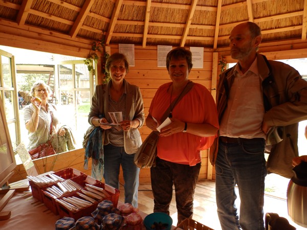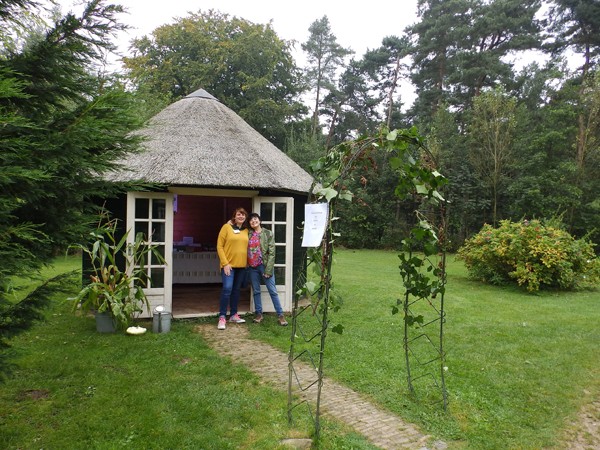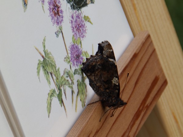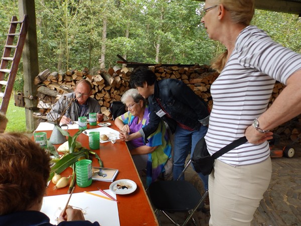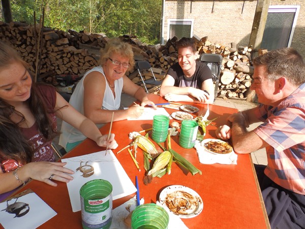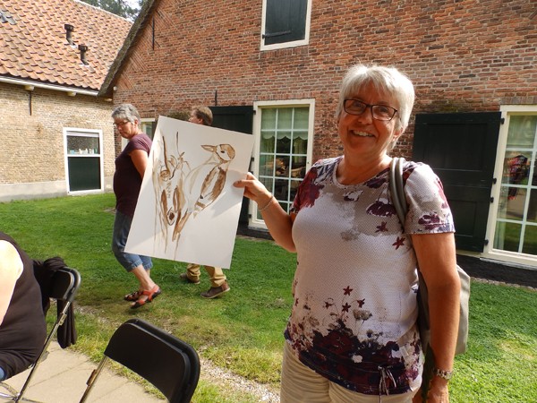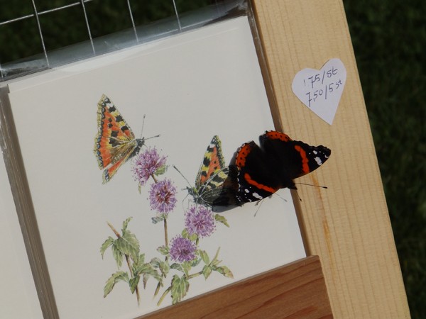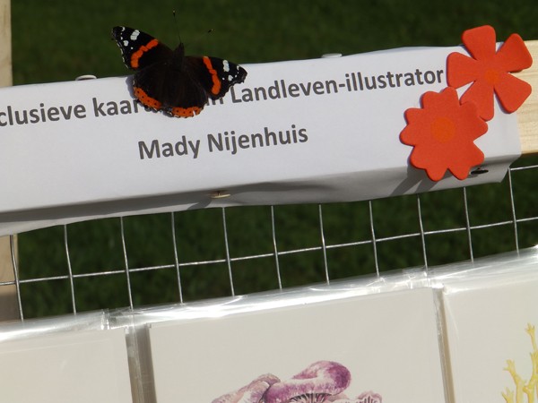 Bister, wat is dat? hoorde ik talloze malen. Velen durfden de uitdaging aan en schoven aan bij de workshop. Ze tekenden met pen en penseel, met toewijding en plezier. Sommige cursisten kwamen erachter dat er meer talent in hun school dan ze ooit gedacht hadden. De workshop vond plaats in de grote kapschuur, vlak bij mijn stand: het theehuisje Hoogmade. Ik was ontzettend blij met 'mijn theehuisje', dat ik helemaal naar wens mocht inrichten. Terwijl ik les gaf werd mijn stand bemand door vrienden en familie, zonder wiens hulp ik dit niet had kunnen doen! Tot mijn plezier trokken mijn kaarten niet alleen mensen, maar ook vlinders. Deze laatsten bezochten met name de vlinderkaarten. De standbemanning werd goed verzorgd door Landleven en medewerkers van Reed Business en het Openluchtmuseum. Daarnaast nog de zorg voor de 30.000 bezoekers en de vele, vele andere standhouders. Hartelijk dank en petje af, beste mensen!