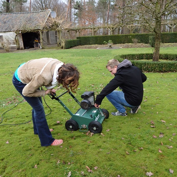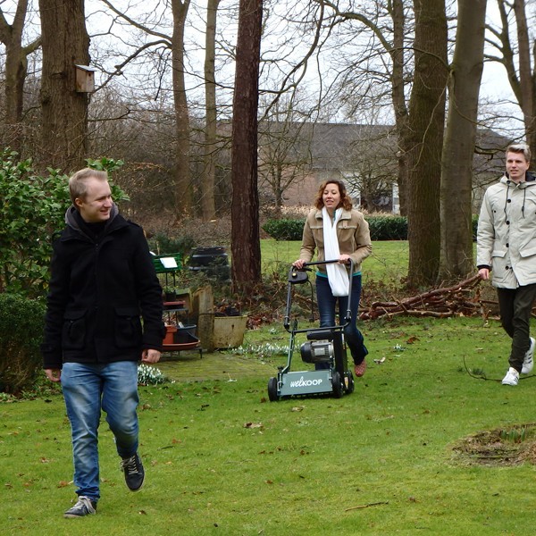 Tuinredacteur Angela Groenbos huurde hiervoor een verticuteermachine bij de plaatselijke Welkoop, en het filmteam (Wouter en Kevin) legde de hele operatie professioneel vast. Helaas werd maar een klein deel van mijn gazon behandeld ....