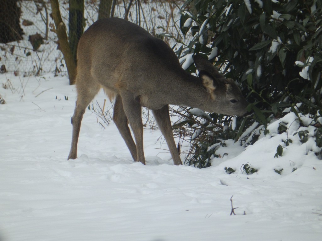 Als er een deken van sneeuw ligt is voedsel schaars voor de dieren in het bos. De reeën wagen zich tot vlak bij het huis en een struik waar eetbare blaadjes aan zitten is natuurlijk welkom.