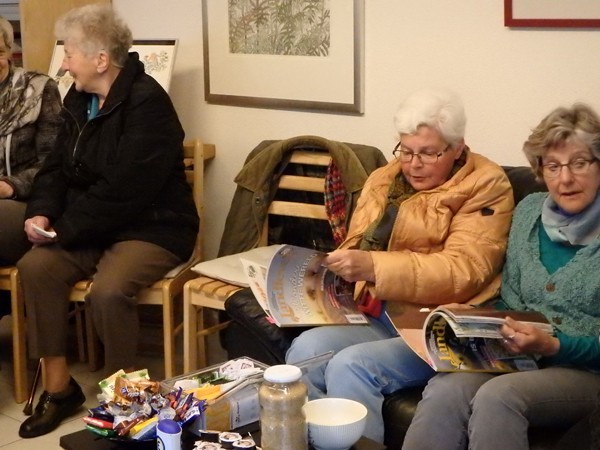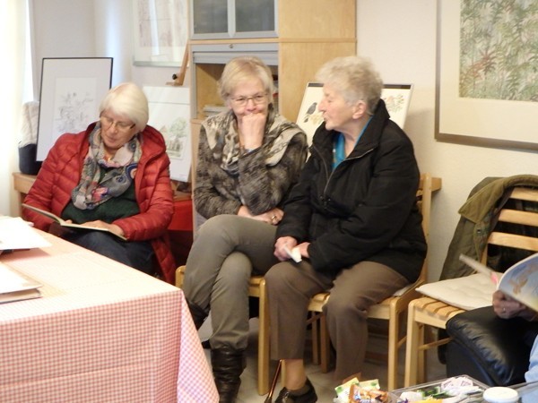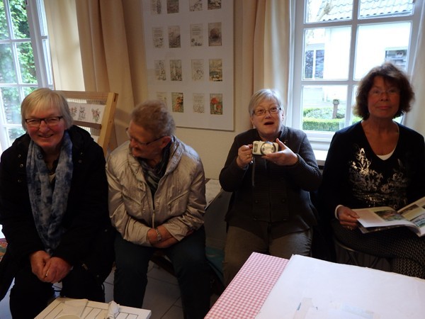 Dertien tuinvrouwen van de club uit Lochem kwamen op 28 april naar mijn tuin. Allemaal even enthousiast en met veel oog voor alles wat bloeide en nog niet bloeide. Want zo vroeg in het jaar was mijn tuin nog maar net aan het ontluiken. Na het eerste deel - de rondleiding door de tuin met verhalen over mijn geworstel met de natuur - konden ze een kopje koffie drinken in mijn atelier, dat ik deels al had ingericht voor de komende kunstvierdaagse. Daar vertelde ik over mijn tekenwerk en alles wat ermee samenhing.