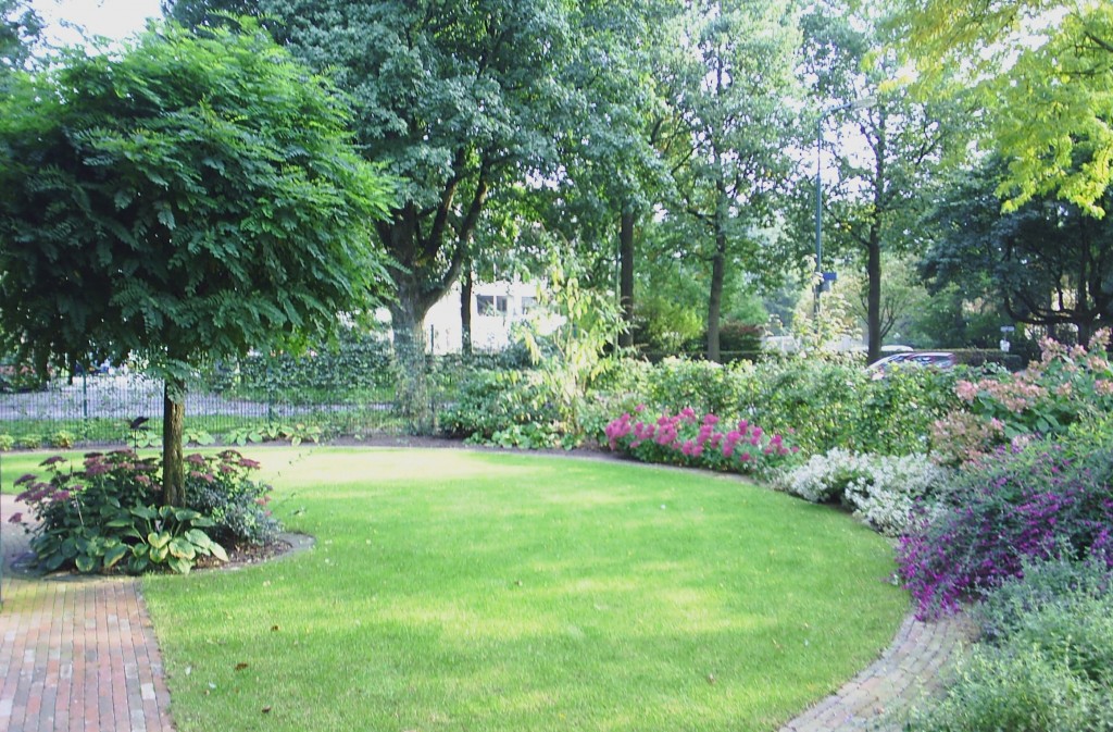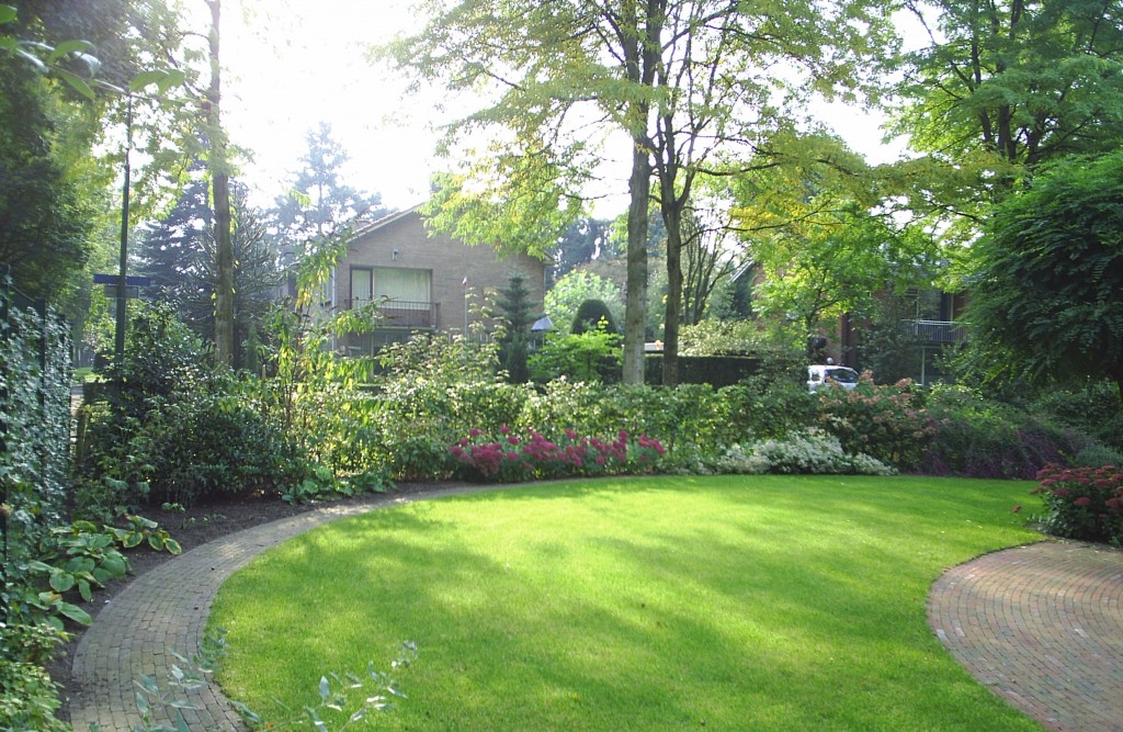 Door de cirkelvorm in het eenvoudige ontwerp lijkt deze tuin breder en groter. Een romantische beplanting doet de rest.
