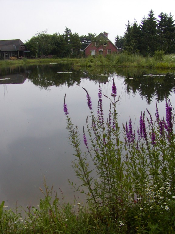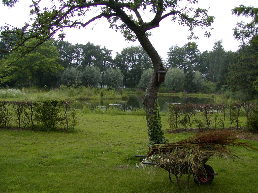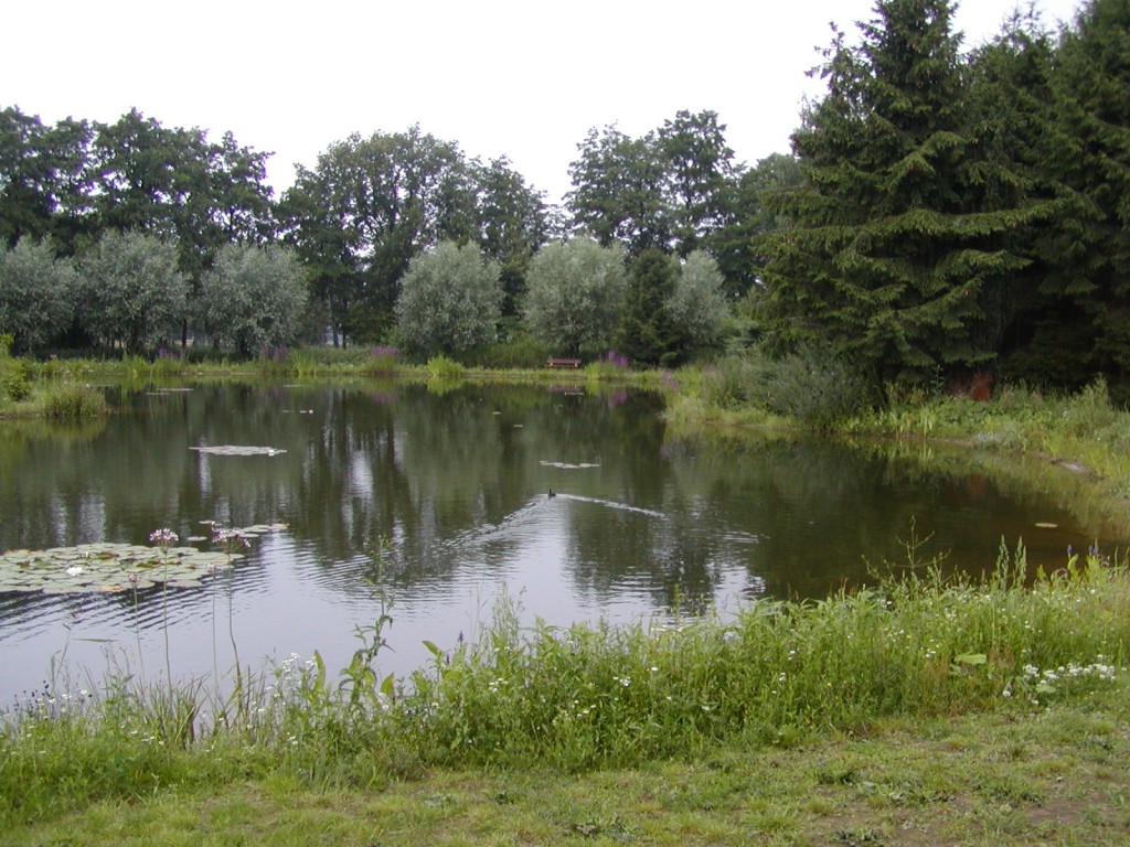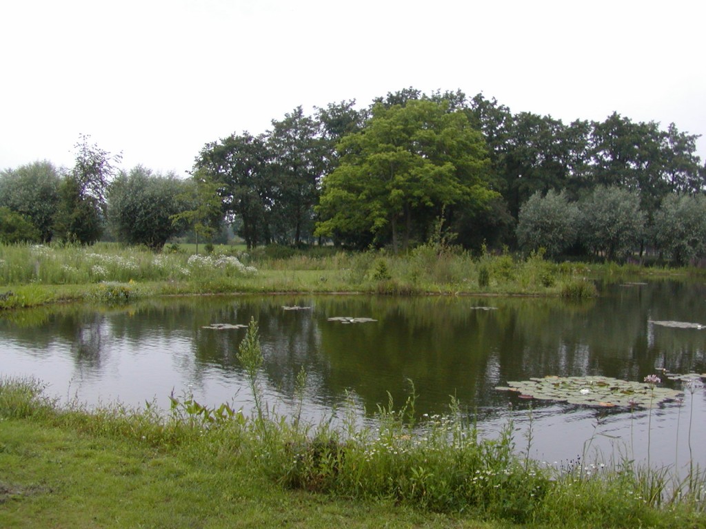 De dubbele vijver (de vijvers behoorden oorspronkelijk toe aan een forellenkwekerij) is samengetrokken tot één grote vijver.