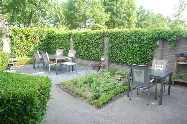 Privacy is belangrijk voor de eigenaars van deze onderhoudsvriendelijke tuin. Een groene muur onttrekt deze tuin aan de blikken van voorbijgangers.