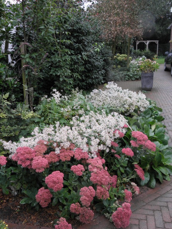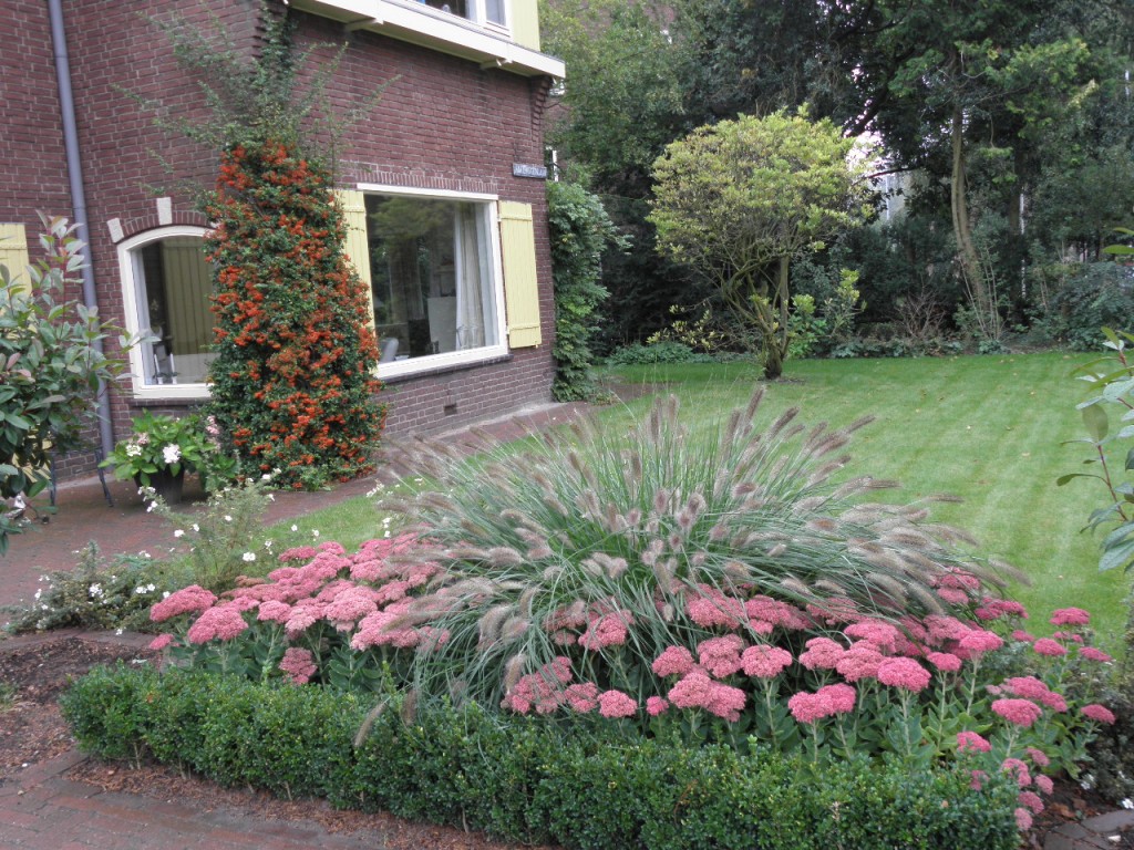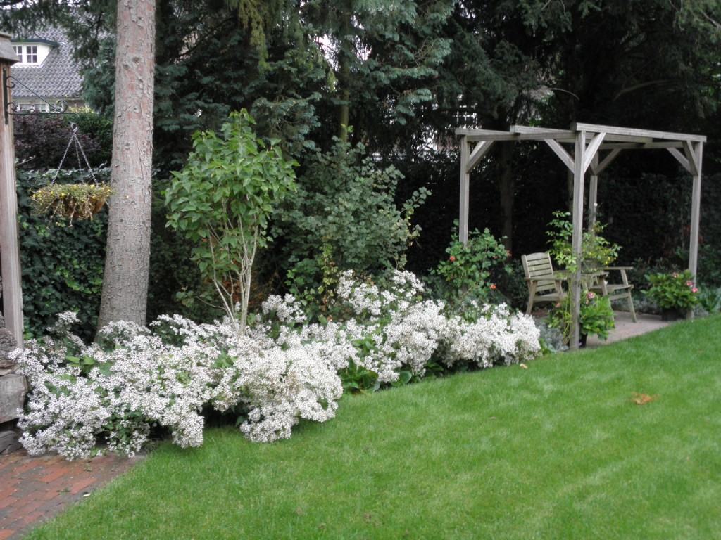 Dat een strakke tuin heel goed romantisch kan ogen bewijst deze tuin, die aan de rand van een dorp ligt. De eigenaars houden van strakke lijnen, maar de beplanting zorgt voor een romantische uitstraling.